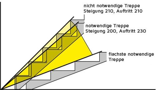 Die Schrittlänge verkürzt sich beim Treppensteigen um das 2-fache der Höhe. Wenn man 10 cm hochsteigt, beträgt die horizontale Schrittlänge nur noch 43 cm (bei 18 cm noch 27 cm). Dadurch ergibt sich ein empfehlenswertes Steigungsverhältnis 18/27 cm für Treppen.