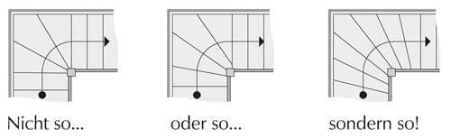 Denn für eine bequeme Begehbarkeit sollte der Gehrhythmus beim Wechsel von den geraden auf die gewendelten Stufen nicht allzu sehr gestört werden.